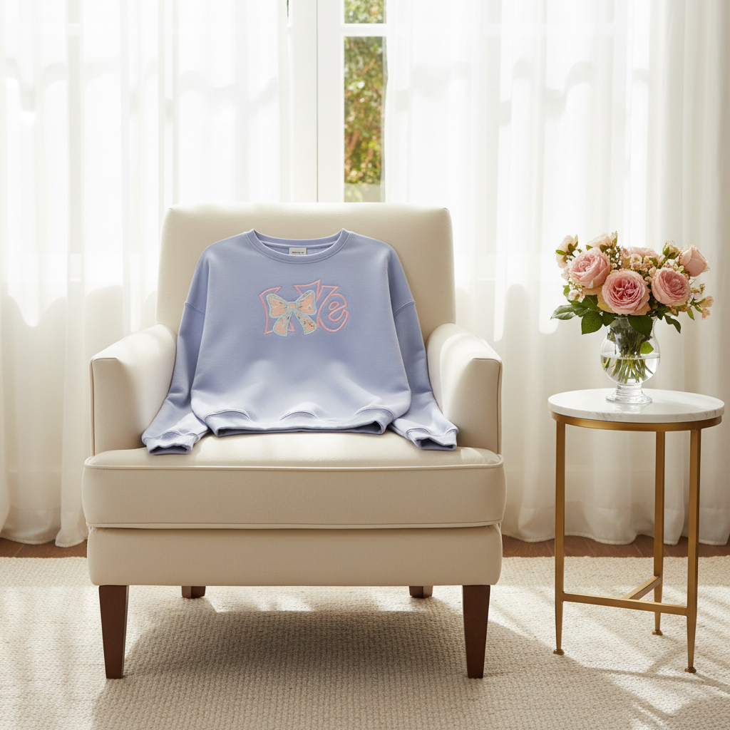This adorable sweatshirt, showcasing the word “Love,” is irresistibly charming, especially with the added touch of a delicate bow that enhances its delightful appeal!